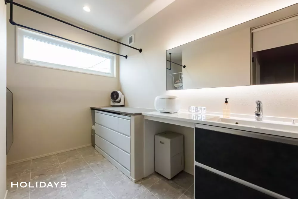 家族が並んで使える広々とした洗面化粧台を採用。ランドリールームにはカウンターを設けることで、洗濯した洋服をそのまま干して、カウンターでたたみ、収納までできるという、洗濯が一か所で完結するラクラクな家事動線になっている。