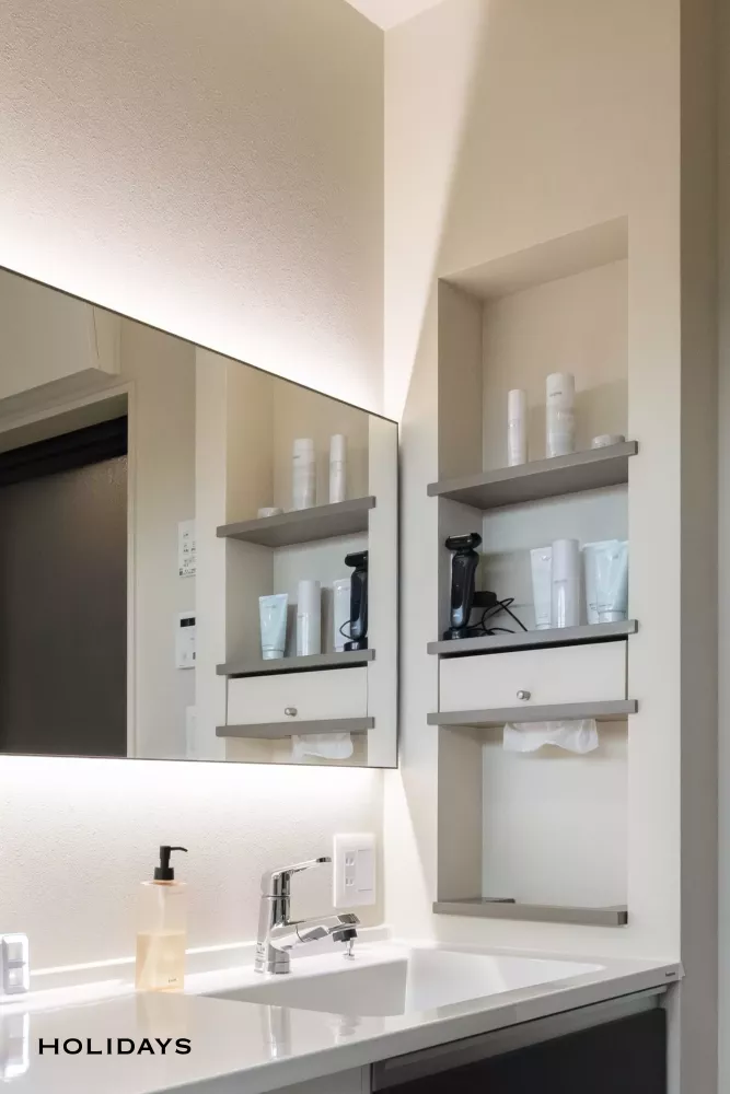 洗面化粧台の横にはニッチスペースを設け使い勝手の良い空間となった。