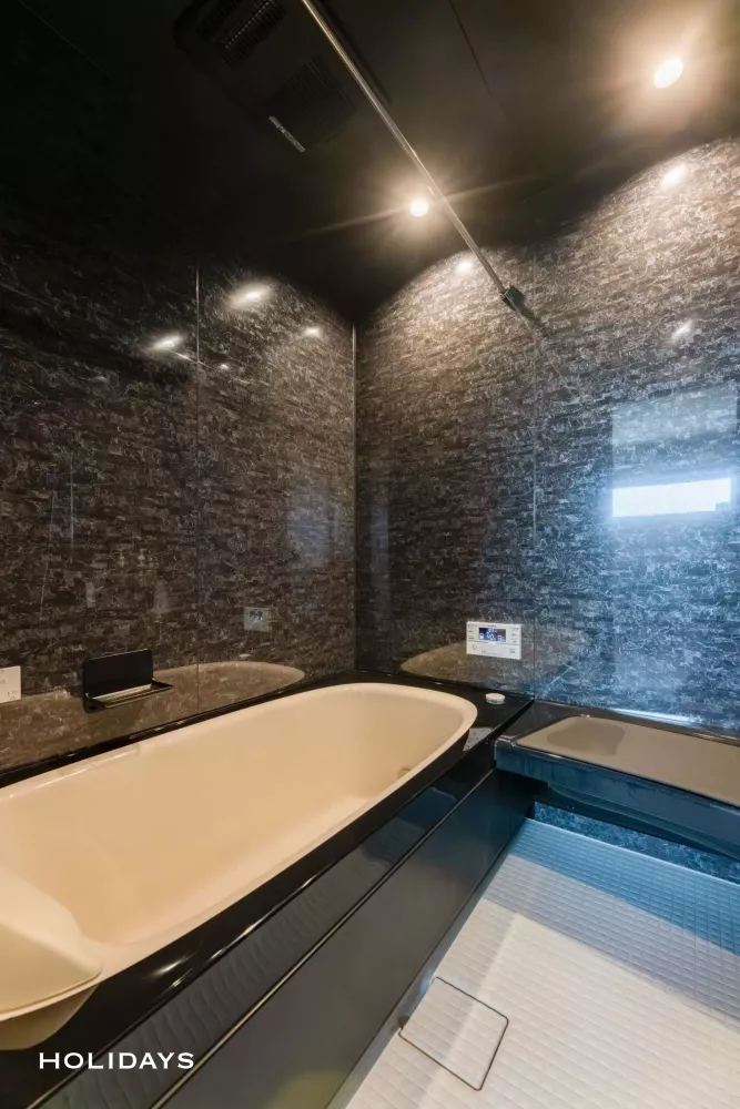 ブラックでスタイリッシュにまとめたお風呂は、ゆったりくつろげるこだわり空間。
