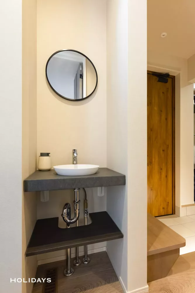 玄関横には、外から帰ってきたらすぐ使えるよう手洗いコーナーを設けた。玄関からは死角になる位置にすることで生活感を隠している。