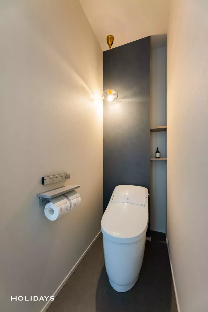 トイレはシンプルにまとめることで居心地のいい空間に。掃除用具や備品をすっきりと隠せる背面収納を採用し、見える部分は飾り棚として活用出来るように工夫した。