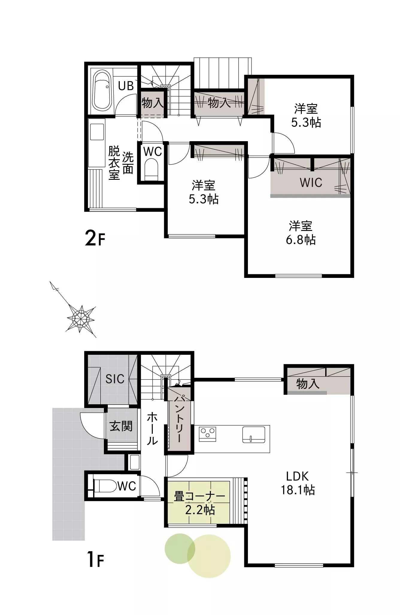 外へ抜ける視線が心地良い、大開口サッシが主役のナチュラルモダンなお家です。外との繋がりを感じる開放的な空間にこだわりました。外観は、ブラックの外壁に玄関まわりの木目がアクセントとして映える上品なデザイン。室内には、シューズインクローゼットやパントリーなどの収納もバランスよく配置しました。さらに1階はパントリーを通り抜けられる回遊動線で、家事がスムーズに進む工夫を散りばめています。