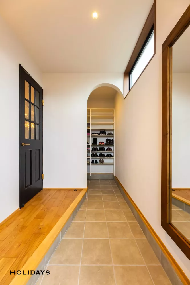玄関タイルは広さ感が出るよう大きめのサイズをセレクト。玄関ドアや軒天も木目を取り入れてナチュラル要素をしっかり確保している。