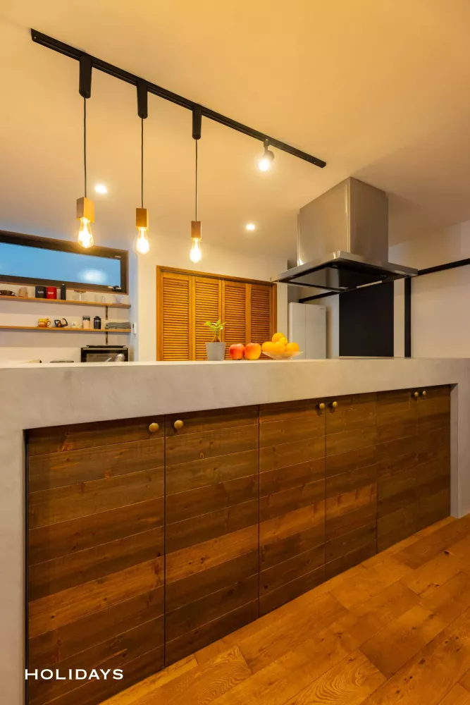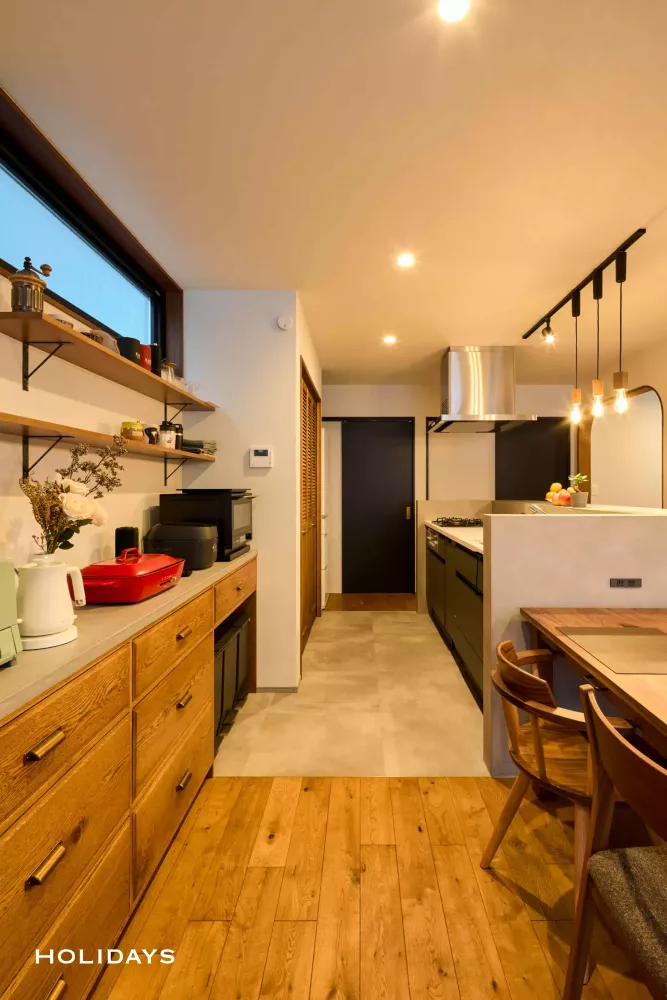 天然木をたっぷりと使用し、真鍮やモールテックスなど経年変化を楽しめる素材を随所に取り入れた、ナチュラルヴィンテージテイストの住まいです。 キッチンやカップボードは造作で仕上げ、空間全体に統一感を持たせながら機能性も追求しました。 ヌックや趣味収納など、ご家族それぞれの「好き」を丁寧に形にすることで、デザイン性と暮らしやすさを両立。 時間とともに味わいを深めていく、永く愛される一邸となりました。