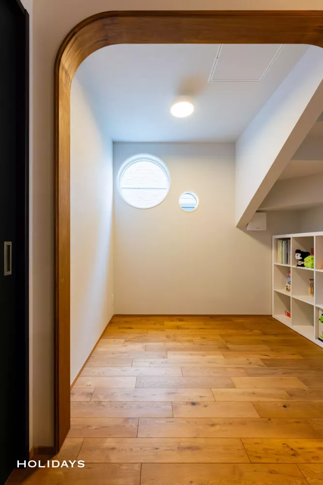 大きさの違う丸窓を設けて、お子様が遊べる可愛らしい空間に。ヌック入口の垂れ壁はオシャレなRの木枠で仕上げた。
