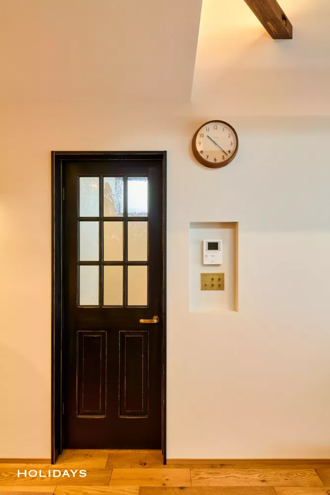 主役になるリビングドアはあえてキズがついたような風合いと雨垂れのような模様のガラスで仕上げ、ヴィンテージな雰囲気をアップさせた。