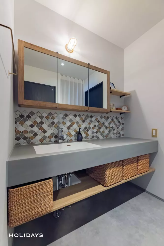 モルタル調とヴィンテージ感のある木目調が美しく調和した洗面空間。レトロなランタン型のモザイクタイルがアクセントとなり、身支度の時間を心地よく高めてくれる。タオルバーやコンセントなどの細かなアイテムはゴールドで統一し、空間全体に上品なまとまりをもたらしている。