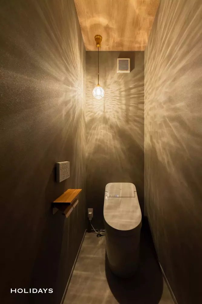 落ち着いた印象になるよう、壁を全面グレーのアクセントクロスで仕上げ、天井には木目柄を選んだ。将来的にサイドに収納を置くため、あえて便器を向かって右寄せにしている。