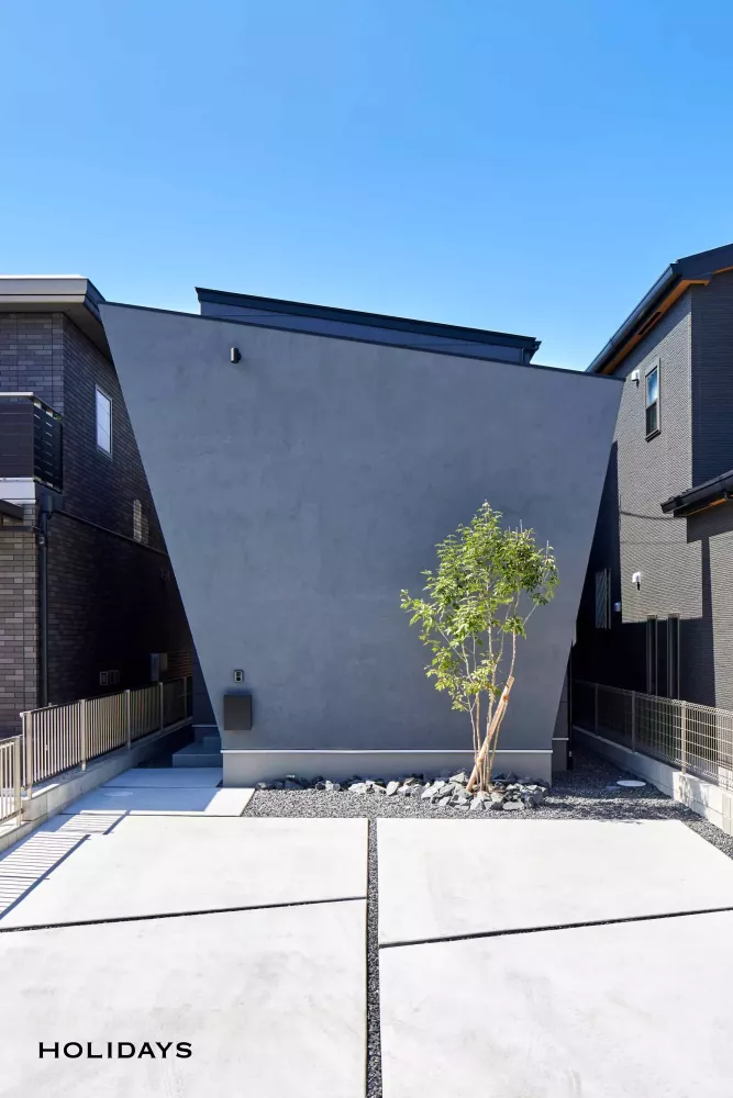 塗り壁の斜め壁がメインとなる、現代アートのようなシンプルモダンな外装。この斜め壁の裏側には自転車などを置いておく便利なスペースが隠れており、外観のイメージを邪魔しない工夫が施されている。