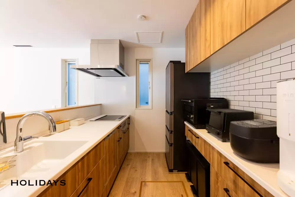 キッチン背面にはホワイトタイル調のクロスを採用。木目のキッチンとの組み合わせで、温かみと抜け感のあるバランスの良い空間に仕上げた。