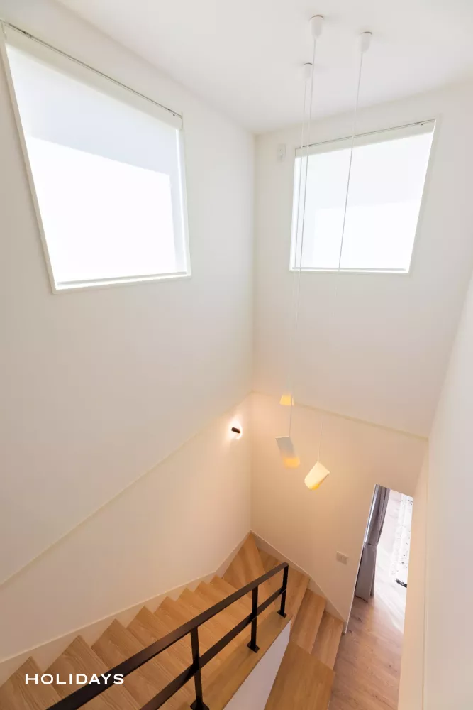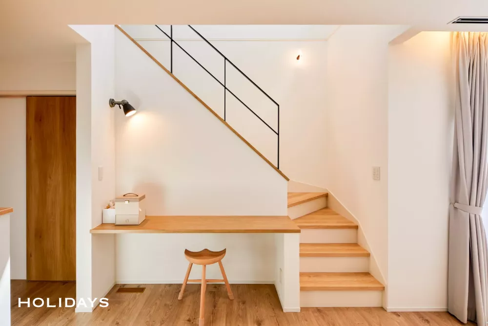 外観は、塗り壁の斜め壁が印象的なシンプルモダンデザイン。内観は北欧テイストの柔らかさを取り入れ、外と内で異なる表情を楽しめる住まいです。特にこだわったのは、照明計画と空間のバランス。間接照明やデザイン性の高い照明器具を随所に取り入れ、やさしい光と奥行きのある空間を演出しています。また、階段前のカウンターや洗面・収納スペースなど、日々の暮らしやすさにも配慮。デザイン性と実用性を両立させています。外観の美しさを保ちながら、自転車スペースなどの機能面もさりげなく確保。細部まで工夫を凝らした、住むほどに心地よさを感じられる住まいです。