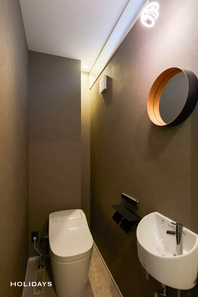 他の空間とは対照的に、全面グレーのクロスで仕上げたスタイリッシュなトイレ。背面収納により衛生用品をすっきり隠し、生活感を抑えている。個性的なペンダントライトがアクセントとなり、大人かっこいい印象を演出する。