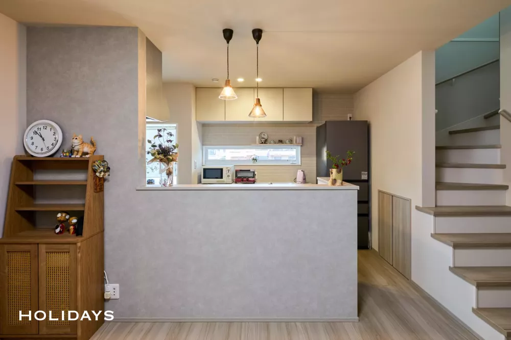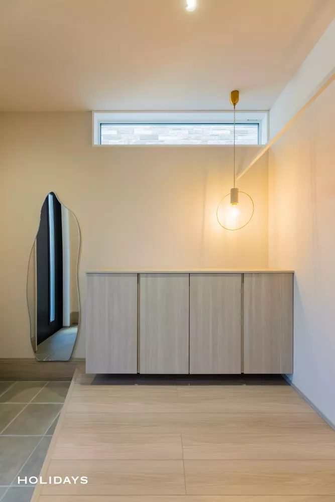 外観はブラック×オレンジ木目を組み合わせた、落ち着きのある和モダンデザイン。斜め天井のアプローチにより、玄関に広がりと奥行きを演出しています。内観はグレージュを基調としたフェミニンジャパンディテイスト。和の要素にドット柄やトラバーチン調の素材を組み合わせ、大人可愛い上品な空間に仕上げました。照明や素材感にもこだわり、やさしい光が広がる落ち着いた雰囲気を演出。デザイン性と暮らしやすさをバランスよく取り入れた、心地よい住まいです。