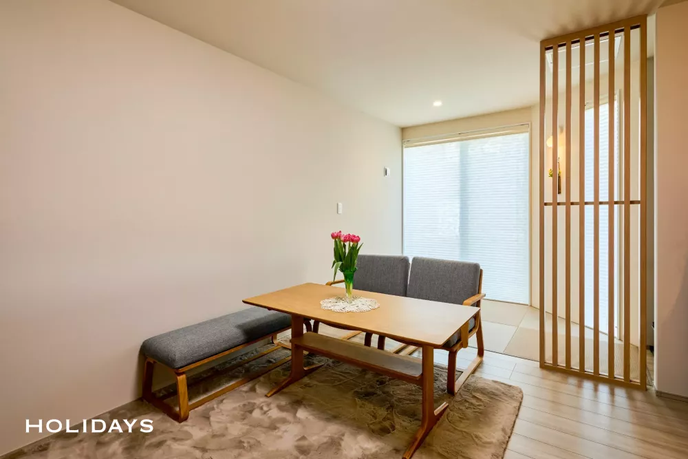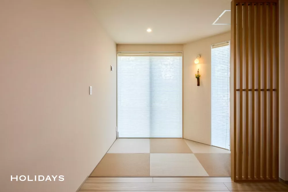 和室空間もベージュ系でまとめて流行りのジャパンディテイストに。リビングに入ってすぐ目に入るルーバー造作は、見た目のアクセントとしてだけでなく、さりげない目隠しとしても機能するちょうどいいサイズ感
