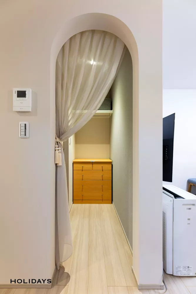 R垂れ壁にレールカーテンを組み合わせてクローゼットの入り口も可愛く。