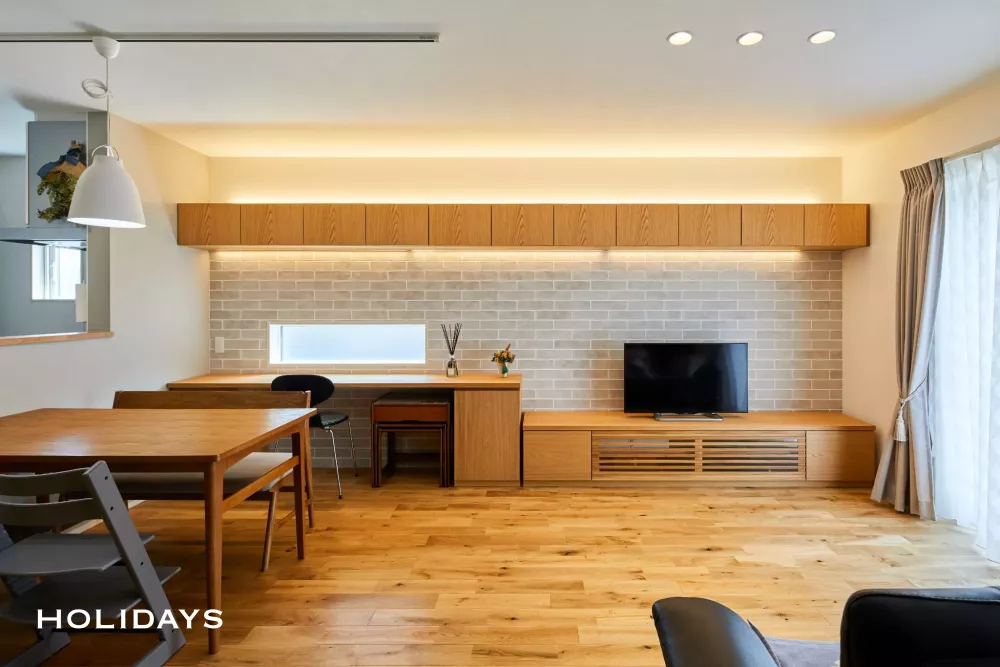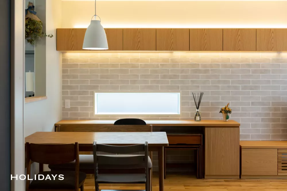 タイルをアクセントに施したLDKの壁には、しっかりと収納もできるよう吊り棚を設置。