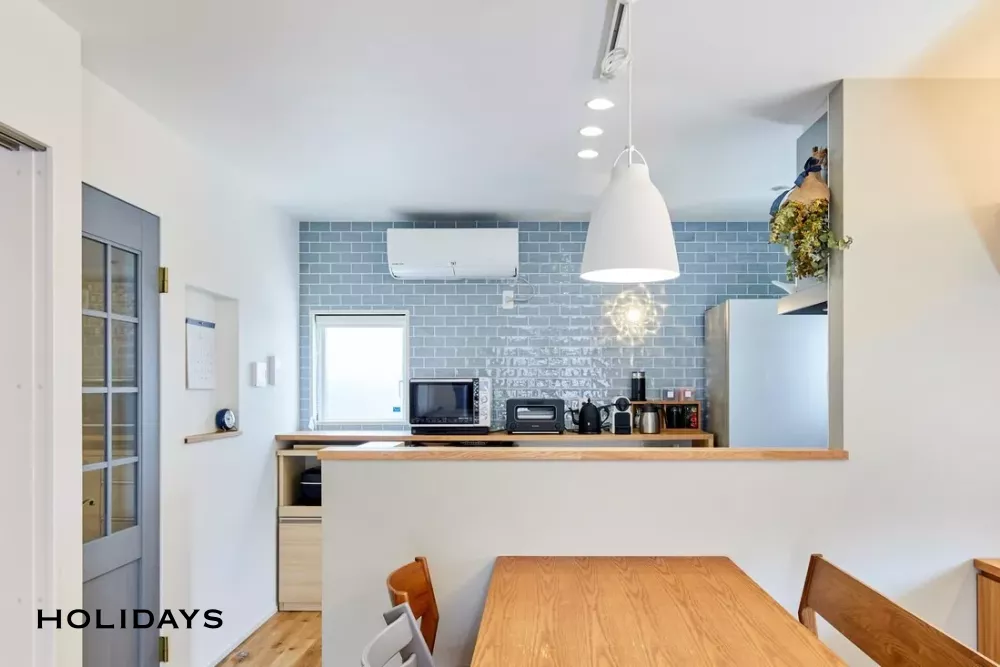 キッチンの背面には淡いブルーの鏡面仕上げタイルをあしらっている