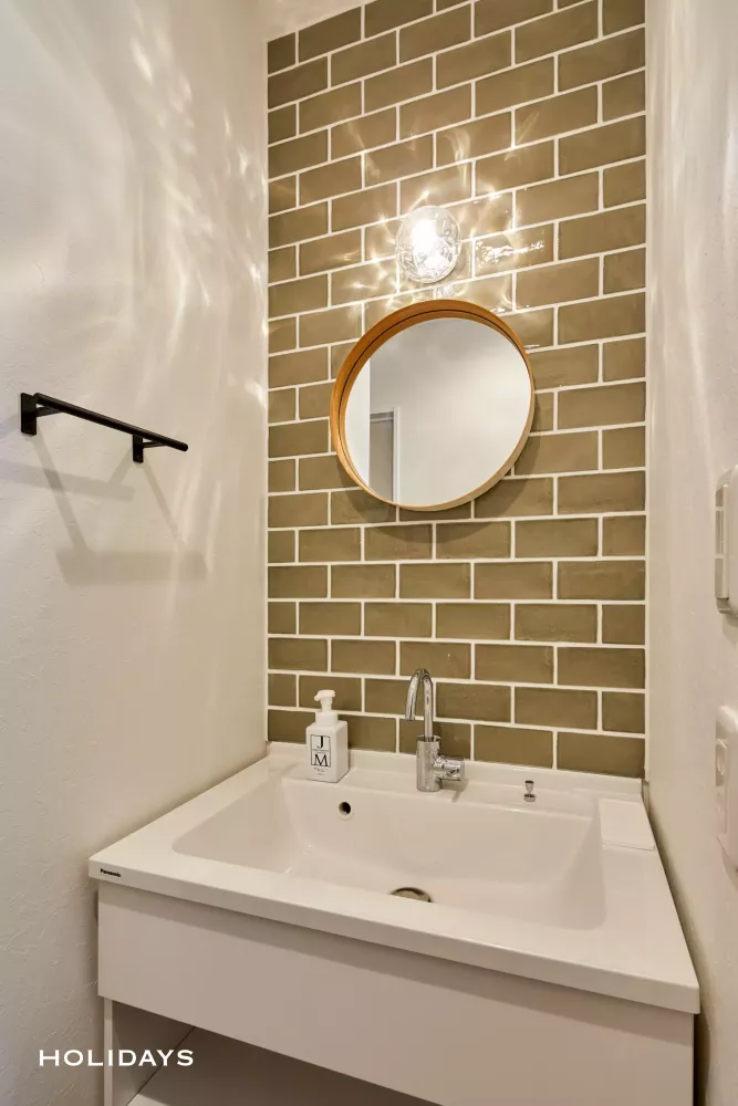 鏡と照明を丸みのあるものに統一した優しく暖かみのある洗面台