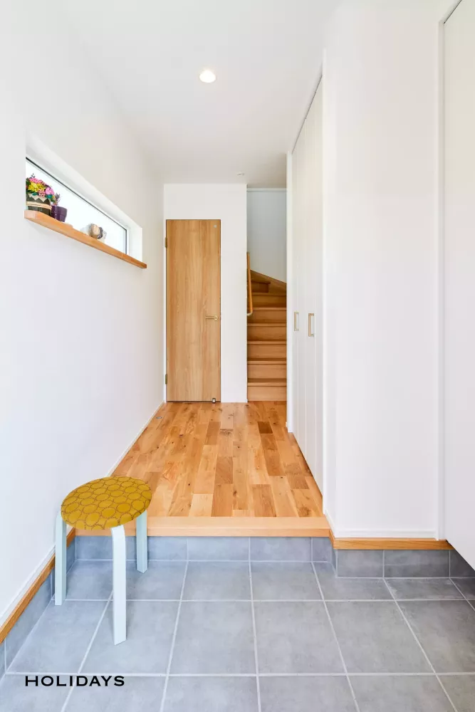 大き目のシューズクロークのある玄関。土間スペースも広く使い勝手も良い