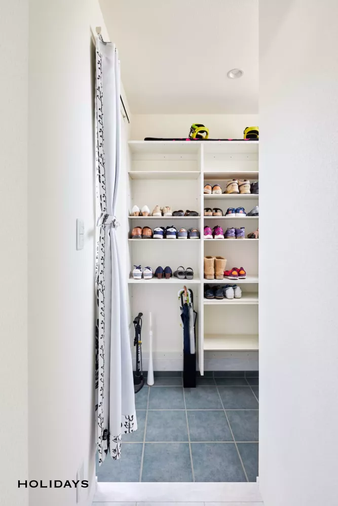 玄関にはシューズインクロークも併設されており、靴やアウトドア用品をたくさん収納できる