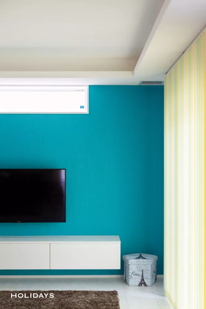鮮やかなターコイズブルーの壁紙は心地よさと安心感を与えてくれる