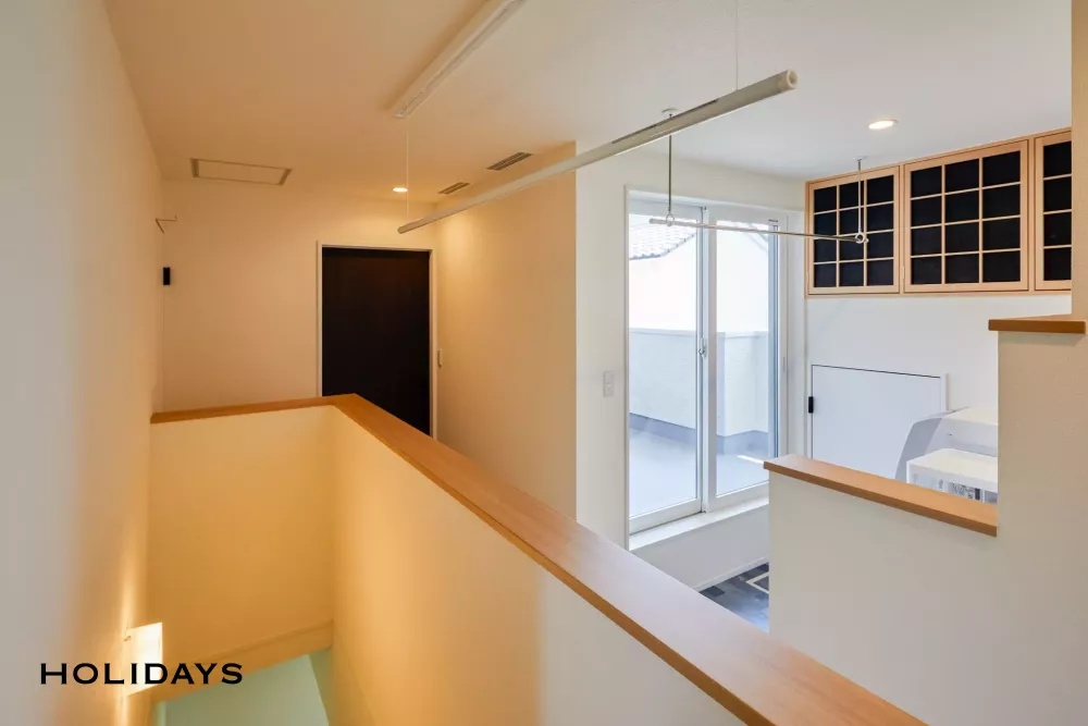 2階廊下部分には室内干し用のユニットを設置。昇降式なので使わない時は収納できる