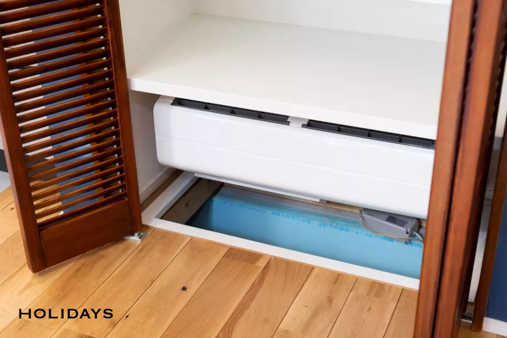 パントリー収納の下部には床下エアコンスペースを完備。床下から空調してくれるため、足元のヒンヤリ感を感じることなく快適
