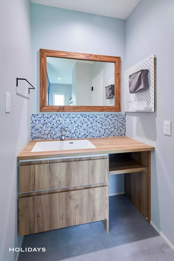 可愛らしいタイルを散りばめたお洒落な洗面スペース