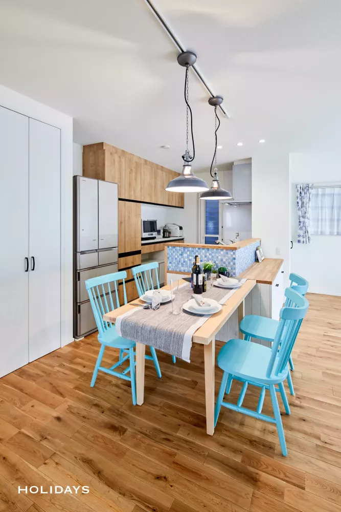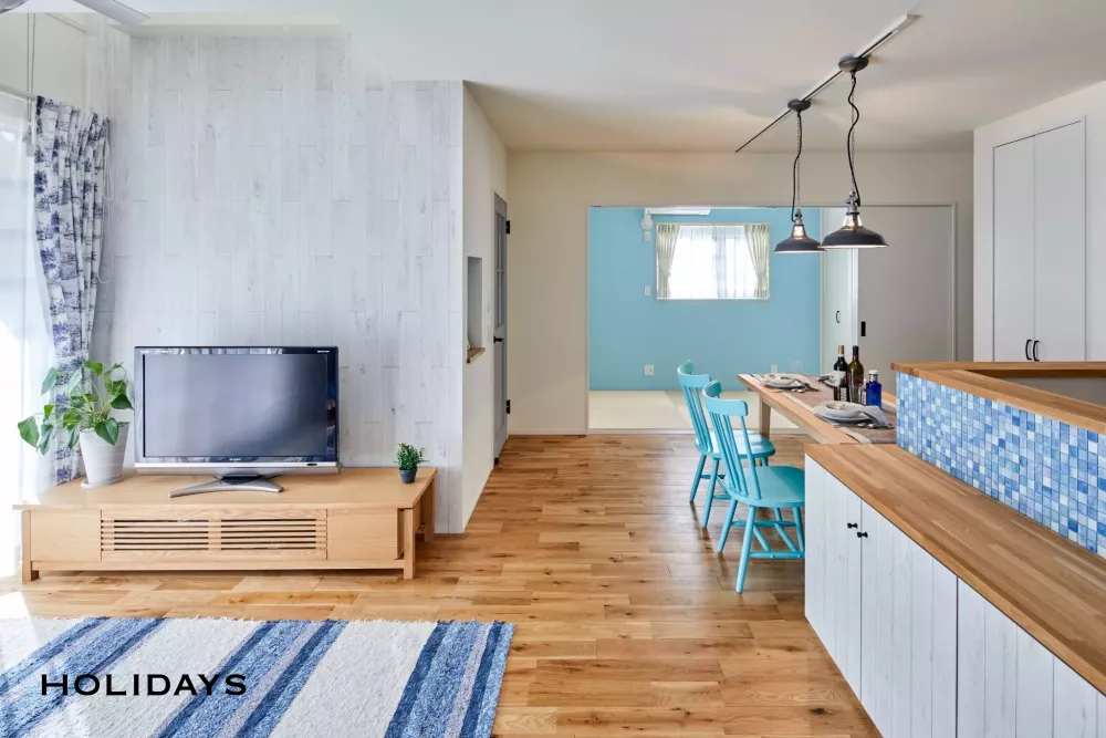 お住まいの中のインテリアも淡いブルーを差し色に、どことなく海を感じられるようにしつつも、居心地の良い空間を目指した。