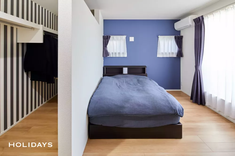 主寝室は濃いめのブルーアクセントクロスで落ち着いた印象に