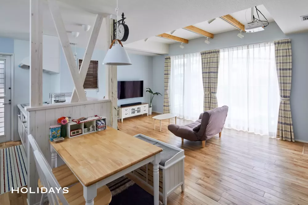 海を感じさせる淡いブルーを基調とし、カントリー風をイメージした家。見せ梁のある折り上げ天井を採用したLDKは天井高が高く、明るく開放的。