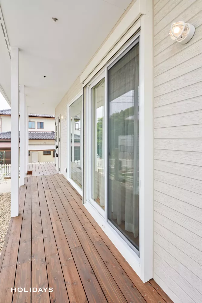 玄関ホールにはアーチを描いた垂れ壁のあるセカンド洗面を造作し、可愛らしい雰囲気に。セカンド洗面は帰宅時の手洗いのほか、来客時に生活感のある洗面所に案内しなくてもよく、使い勝手が良くなります。 玄関からLDKにつながる入口もアーチを描いた垂れ壁にし、リビングへの期待を高めてくれます。LDKは淡いブルーをアクセントとした爽やかなカントリー風。リビングにはプロジェクターと収納式スクリーンを設置し、映画好きにはたまらない空間になっています。 2階には主寝室と子供部屋に合わせ、家族で使える4帖以上のファミリークローゼットも設計。家族みんなで共有して収納が出来ます。 玄関にはシューズクロークを設け季節や用途に合わて、普段はかないシューズやアウトドアグッズを大量に収納できます。 外観はサーファーズテイストで、真っ白な木の外壁と広い軒で存在感を出しています。 芝生を基調としたお庭に玄関続きのウッドデッキで印象的なお庭に仕上がりました。
