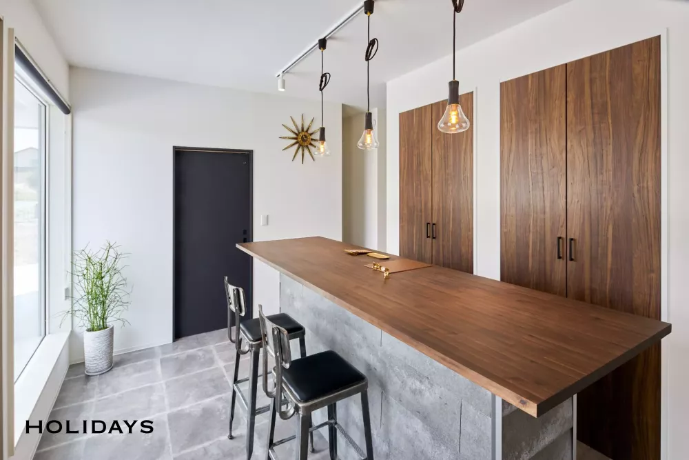 店舗併用住宅とは、その名の通り、自宅と仕事場を一緒にした住居形態です。店舗併用住宅は通勤時間がかからないので、家族との時間を確保しやすく、仕事と家庭・育児を両立しやすいというメリットもあります。 今回のお住まいは美容室との店舗併用住宅。1階の店舗スペースはおしゃれかっこよく仕上げ、家族の居住スペースである2階はラフで明るい、家族との愉しい時間を過ごせる空間に仕上げています。 また、家族の過ごせるLDKの壁面には施主様がお気に入りの小物を飾れる棚も造作しています。 お洒落な店舗と居心地の良い居住スペースを併せ持った、施主様の好みのテイストを盛り込めた、こだわりの注文住宅が完成しました。