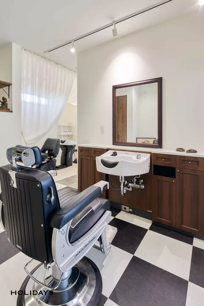 店内はフェミニンで清潔感のある空間に、チェッカー柄のフロアタイルを敷き詰めたヴィンテージアメリカンなテイストを散りばめた。