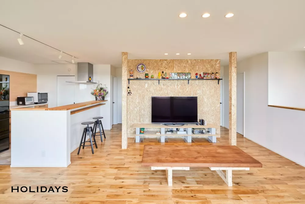 OSB(構造用合板)をインテリアに活用し、家族で落ち着けるラフな空間に