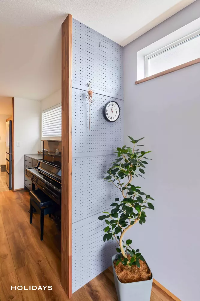 LDKの壁の一部は有孔ボードにし、お気に入りの小物や時計を飾ることができる