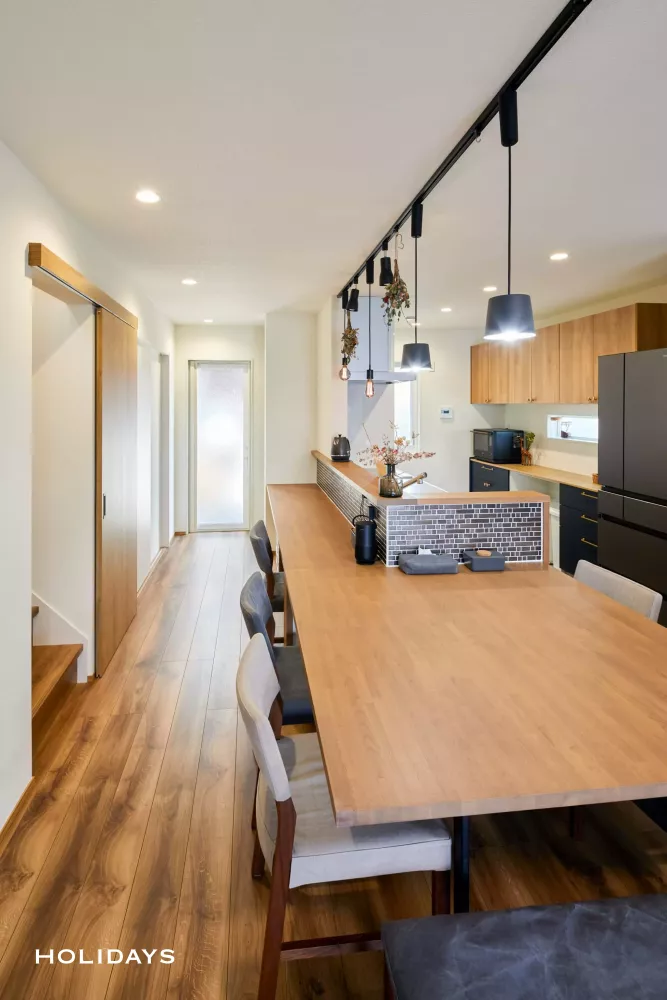 ダイニングはキッチンと一体型。6人家族でも同時に座れるようにテーブルを囲む形にした