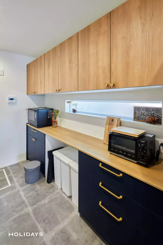 アイランドキッチンの背面には大容量の収納を確保し、大家族でもスッキリ収納できている