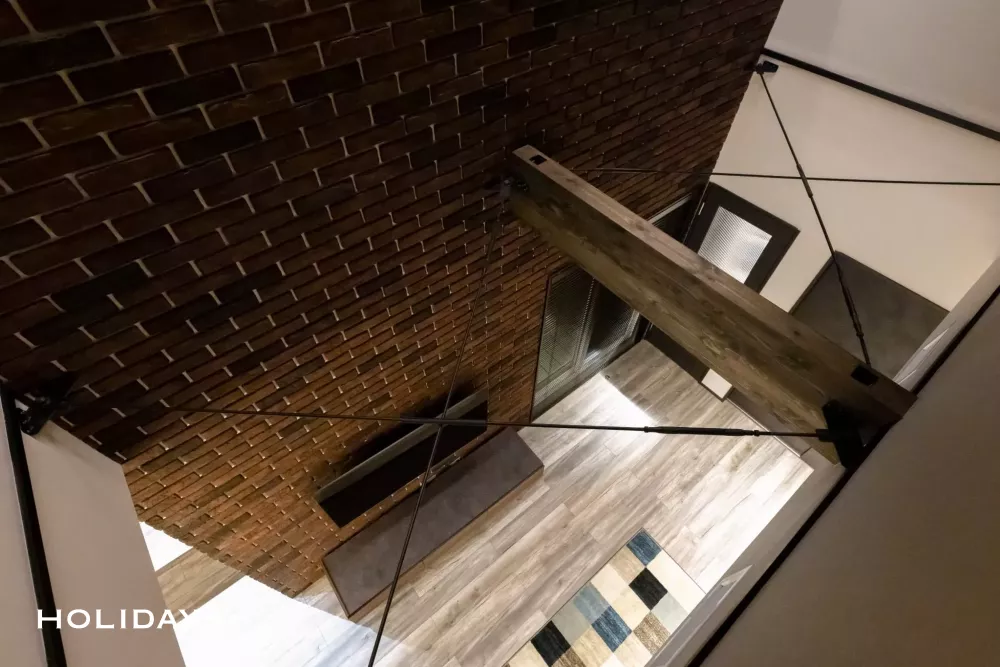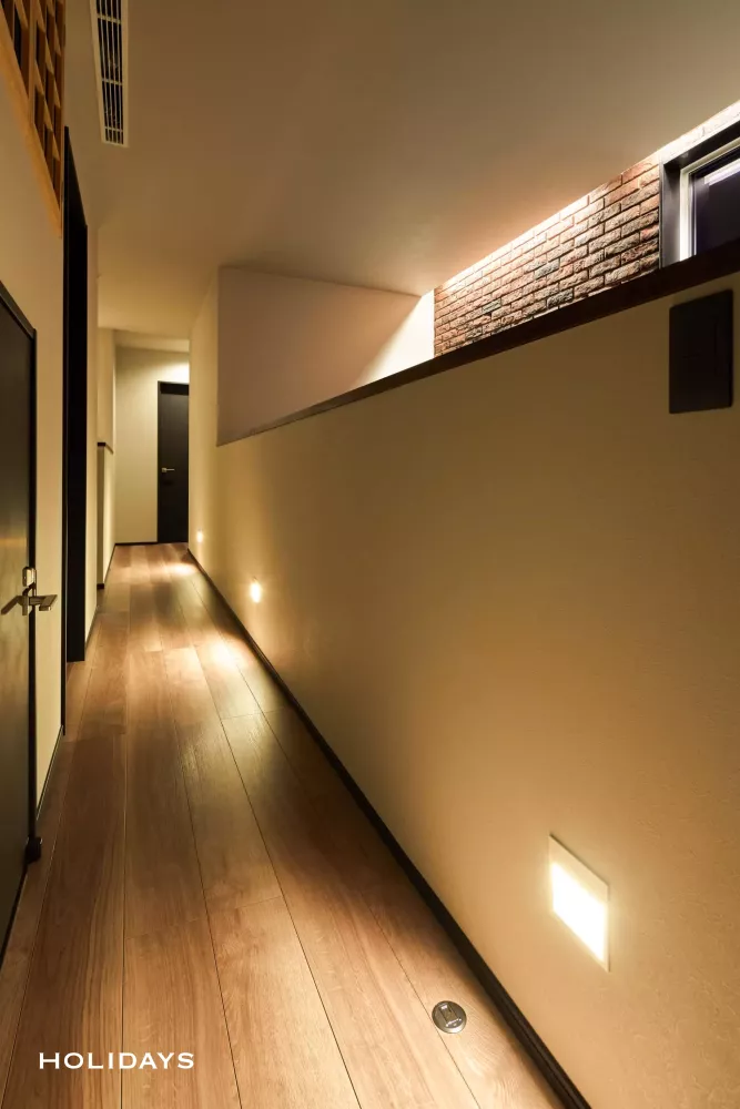 壁面のレンガにあたる間接照明の光によって魅力的な陰影が映し出される