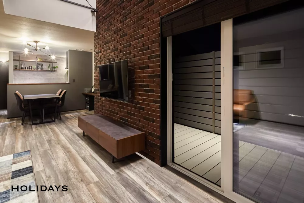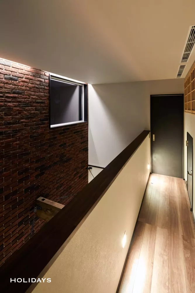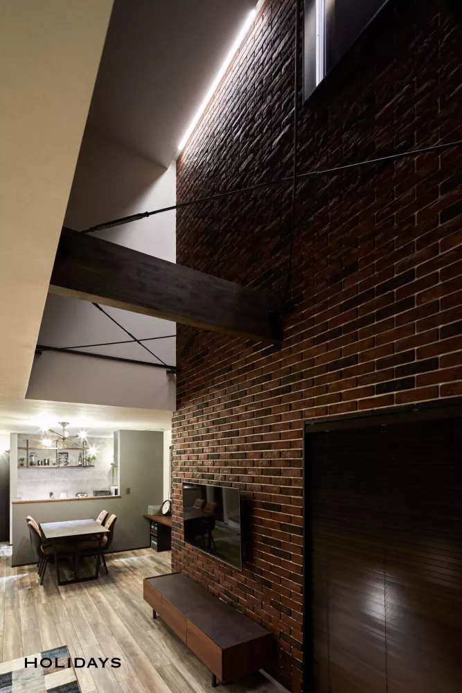 ダークトーンの素材や部材を用いて、落ち着いた大人っぽい雰囲気のお住まいが完成しました。こだわりのレンガ壁面は、間接照明によって映る陰影がレンガの凹凸感を出し、魅力的な空間へと仕上がりました。
