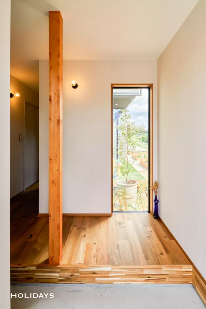 玄関から入るとまず目に入るのが正面の窓。まるで額縁のように庭の風景を切り取り、季節の移ろいを感じさせてくれる