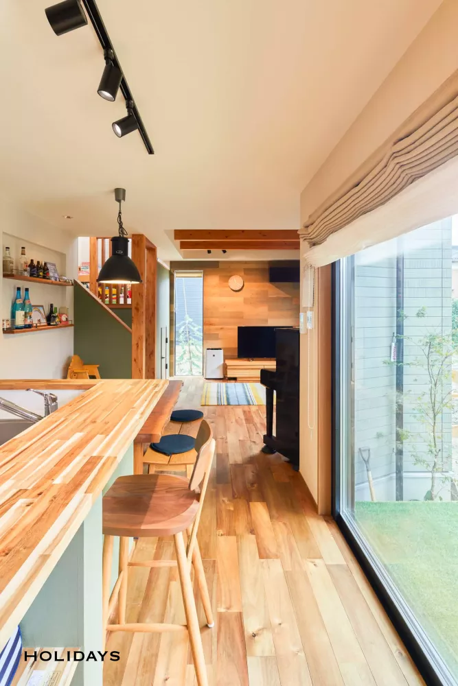 カウンターのあるキッチン。キッチン前の大きな窓からは、お庭にいるご家族の様子や、庭の様子を臨める
