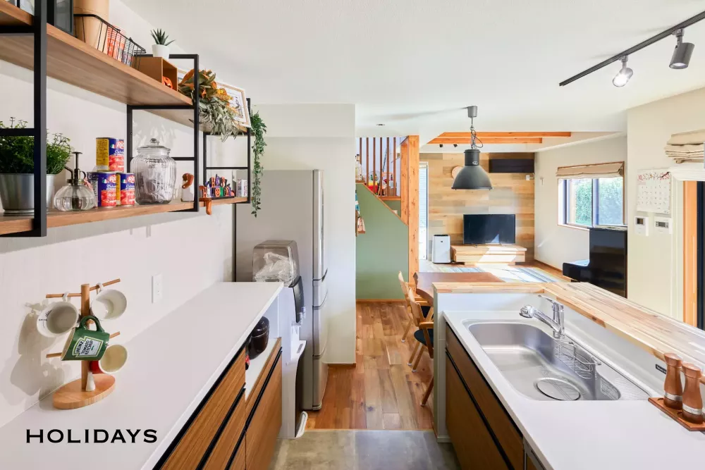 キッチンの背面には造作棚。可愛い小物を並べられ、日常を愉しいものに