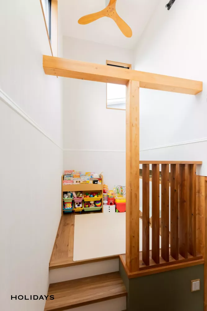 リビング階段の中腹には中二階としてプレイルームを採用し、多階層の面白みのある設計。