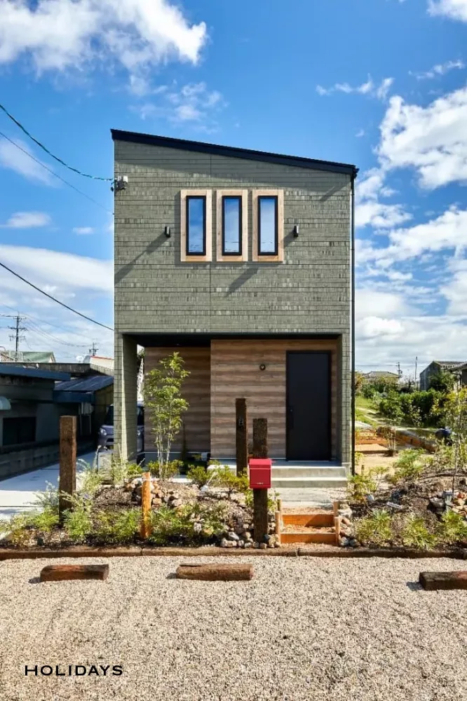 木目調とカーキの外壁を組合せたナチュラルでかっこいい外観。正面の窓サッシはも木材のモールで仕上げてアクセントに