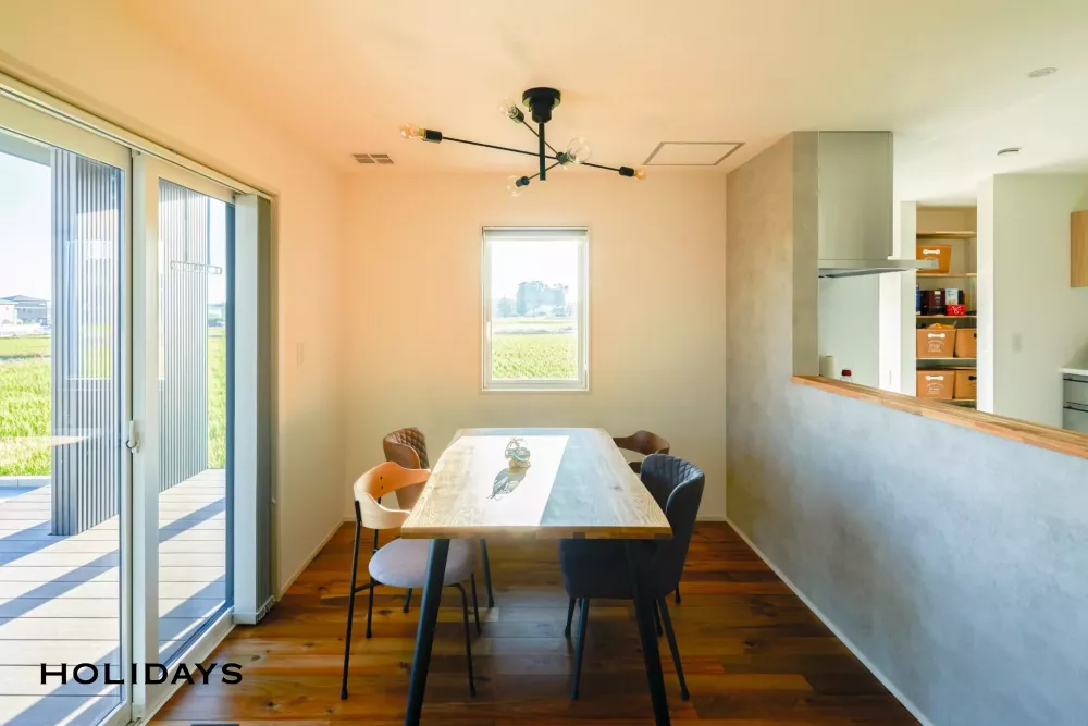 ウッドデッキにつながるダイニング。窓から差し込む太陽の光が心地よい