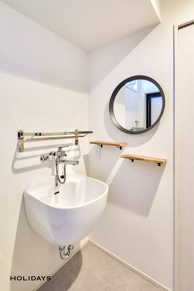 シンプルな洗面化粧台はスッキリと清潔感がある。脱衣所とは別のスペースに設置することで、来客時でも気兼ねなくお使いいただける