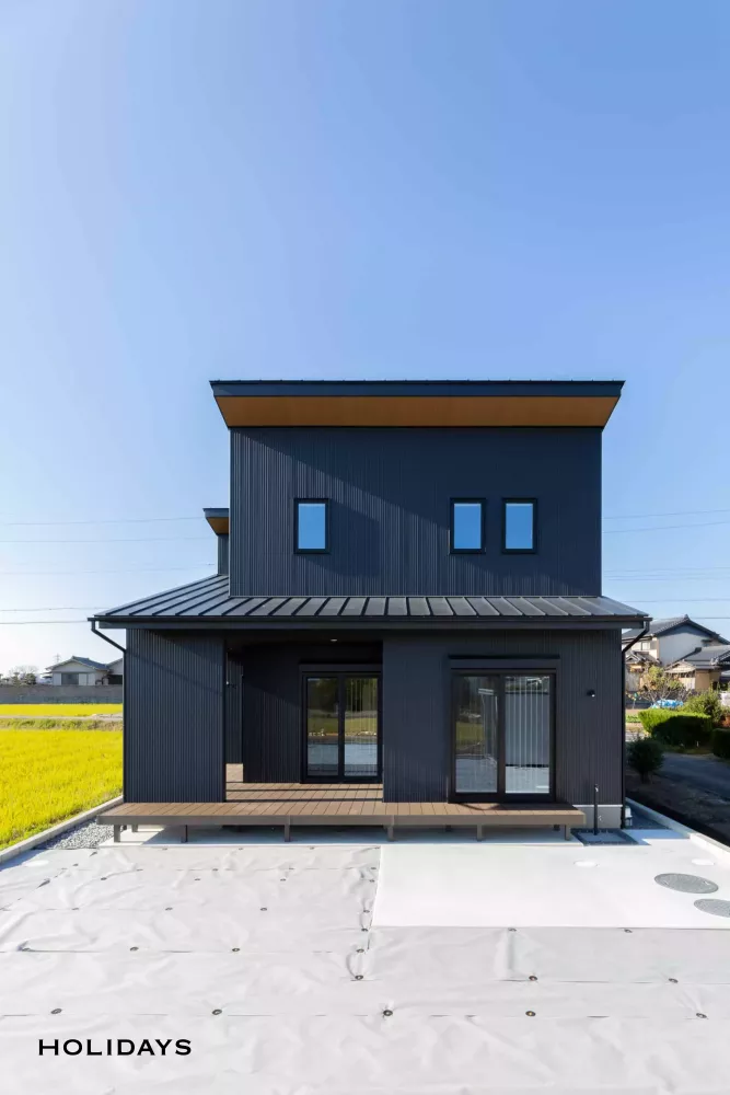 家族みんなが過ごしやすくなるようにと、シューズインクロークとミセスコーナーをつなげ、お買い物後に便利な動線を確保しました。また空間に無駄のないように階段下の空いたスペースに収納スペースを設けるなど間取りの工夫が詰まったお住まいです。外観はガルバリウム鋼板を全面に使用してかっこよく仕上げ、内装はアカシアの無垢床を採用し温かみのある空間に仕上げ、メリハリのあるお住まいが完成しました。
