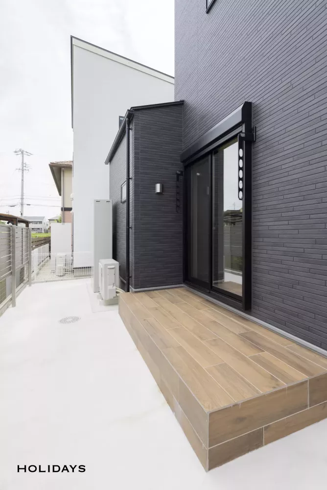 施主様のこだわりのポイントである建物間口いっぱいの木目調タイルデッキが印象的