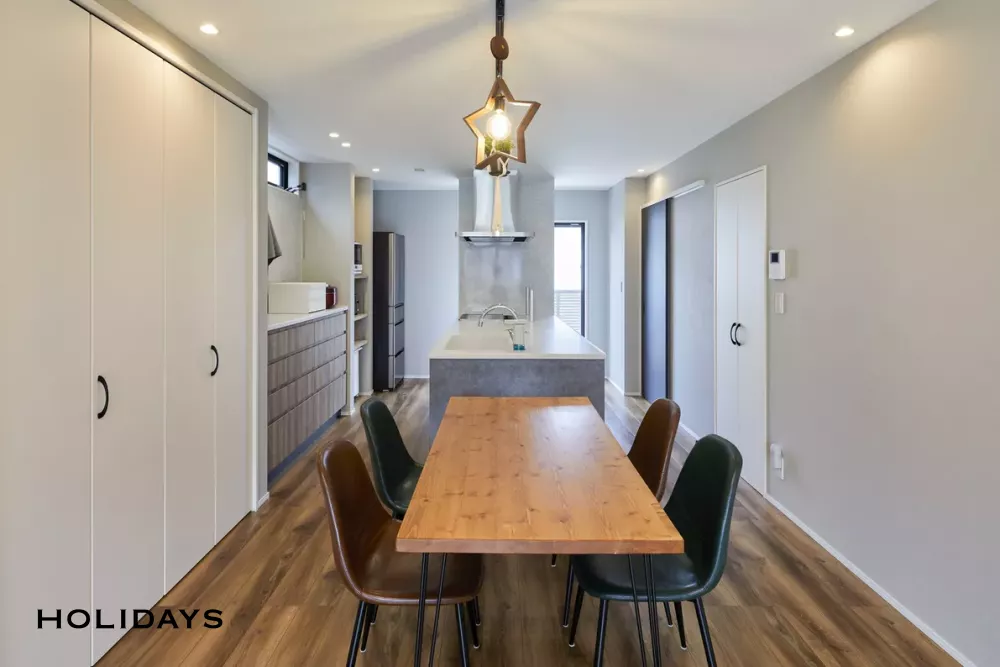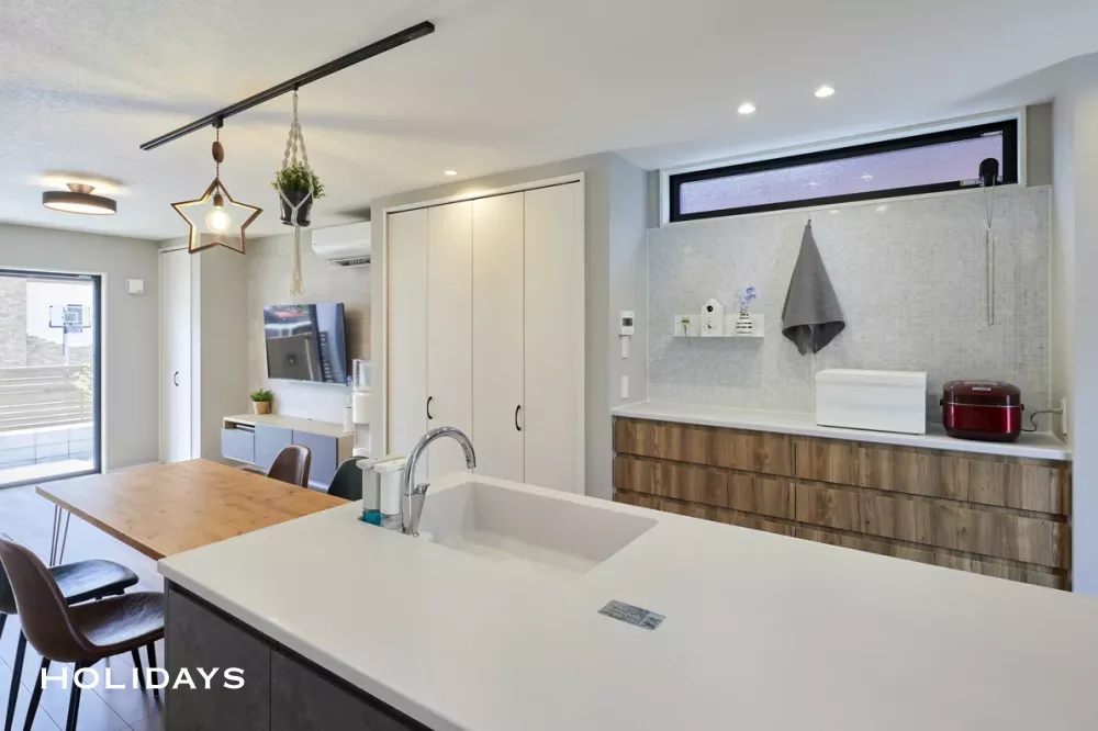 内装外観ともに色味にこだわった、北欧系のナチュラルテイストのお家が完成しました。どの箇所もスタイリッシュでオシャレな空間に仕上がっています。また階段下に収納スペースを作ったり、キッチンに接する壁の裏側にホーローキッチンパネルを採用することで、見えないところでお子様の連絡資料を管理するなど無駄な空間がないように工夫が施されています。デザインだけでなく、生活動線まで意識したオーナー様のこだわりの詰まったお家が完成しました。
